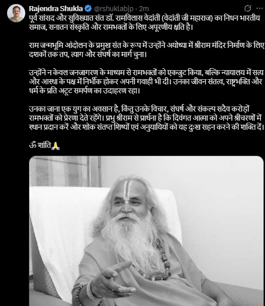 उन्होंने आगे लिखा, ‘उनका जाना एक युग का अवसान है, किंतु उनके विचार, संघर्ष और संकल्प सदैव करोड़ों रामभक्तों को प्रेरणा देते रहेंगे। प्रभु श्रीराम से प्रार्थना है कि दिवंगत आत्मा को अपने श्रीचरणों में स्थान प्रदान करें और शोक संतप्त शिष्यों एवं अनुयायियों को यह दुःख सहन करने की शक्ति दें।’