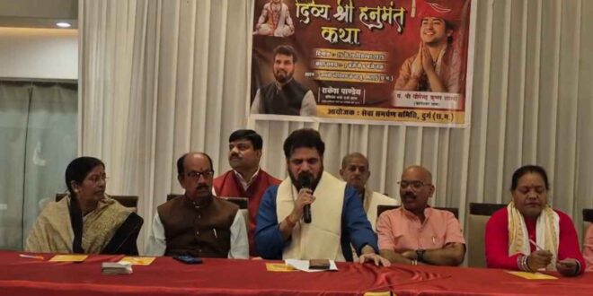 भिलाई में 25 से 29 दिसंबर तक पांच दिवसीय पंडित धीरेंद्र शास्त्री की हनुमंत कथा और दिव्य दरबार का विशाल आयोजन किया जाएगा. यह आयोजन सेवा समर्थन सीमित संस्था द्वारा किया जा रहा है. इस कथा के बारे में जानकारी देते हुए छत्तीसगढ़ खादी तथा ग्रामोद्योग बोर्ड के कैबिनेट मंत्री दर्जा प्राप्त राकेश पांडेय ने पत्रकार वार्ता की. उन्होंने बताया कि जयंती स्टेडियम के समीप स्थित ग्राउंड में कथा का आयोजन किया जाएगा.