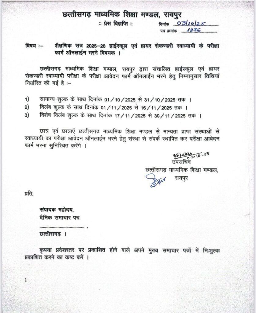 छत्तीसगढ़ माध्यमिक शिक्षा मंडल ने संस्थानों को निर्देश जारी करते हुए कहा है कि निर्धारित समयसीमा के भीतर सभी विद्यार्थियों के परीक्षा आवेदन ऑनलाइन भरना सुनिश्चित करें.