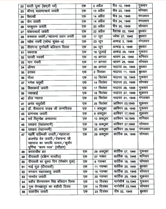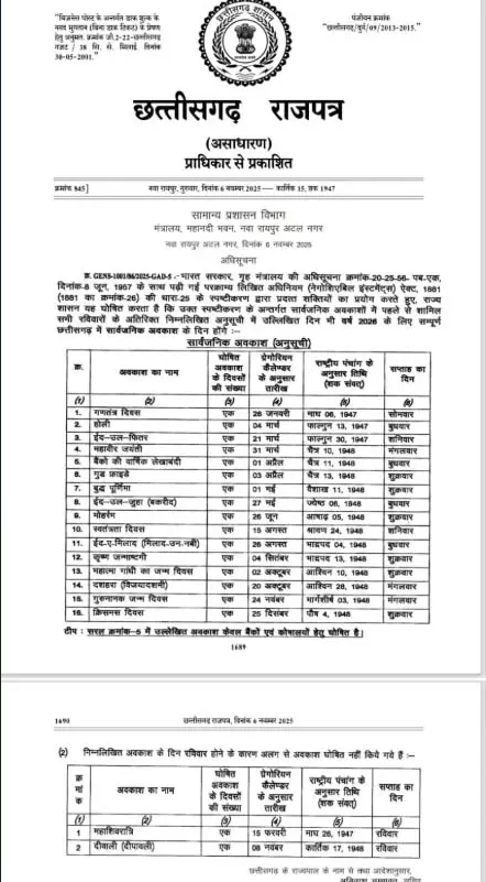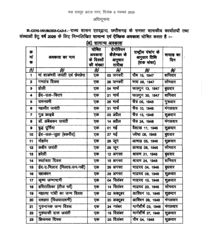 छत्तीसगढ़ सरकार ने साल 2026 के लिए सरकारी छुट्टियों का कैलेंडर जारी कर दिया है. आने वाला नया साल सरकारी कर्मचारियों के लिए छुट्टियां ही छुट्टियां लेकर आया है. इस कैलेंडर में 16 सार्वजनिक अवकाश, 23 सामान्य अवकाश और 56 ऐच्छिक अवकाश शामिल हैं. देखें लिस्ट-