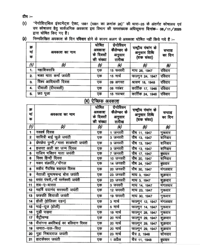 छत्तीसगढ़ राजपत्र के मुताबिक साल 2026 के लिए राज्य के सभी सरकारी कार्यालयों और कर्मचारियों के लिए 16 सार्वजनिक आवकाश दिए गए हैं. वहीं, इनमें दो दिनों में रविवार होने के कारण अलग से अवकाश घोषित किया गया है. इसके अलावा 23 समान्य अवकाश और कर्मचारियों के लिए 56 ऐच्छिक अवकाश का भी ऐलान किया गया है. बता दें कि प्रत्येक कर्मचारी सिर्फ तीन ऐच्छिक अवकाश ही ले सकते हैं.