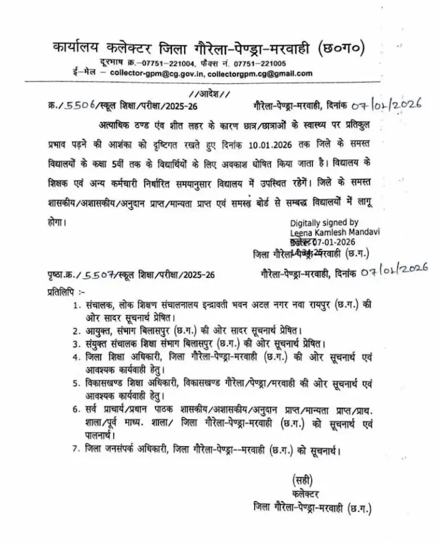 वहीं इन परिस्थितियों को देखते हुए गौरेला-पेंड्रा-मरवाही जिले की कलेक्टर लीना कमलेश मंडावी ने पांचवीं कक्षा तक के विद्यार्थियों के लिए 10 जनवरी 2026 तक अवकाश घोषित किया है. यह निर्णय छात्र-छात्राओं के स्वास्थ्य पर प्रतिकूल प्रभाव पड़ने की आशंका को देखते हुए लिया गया है.