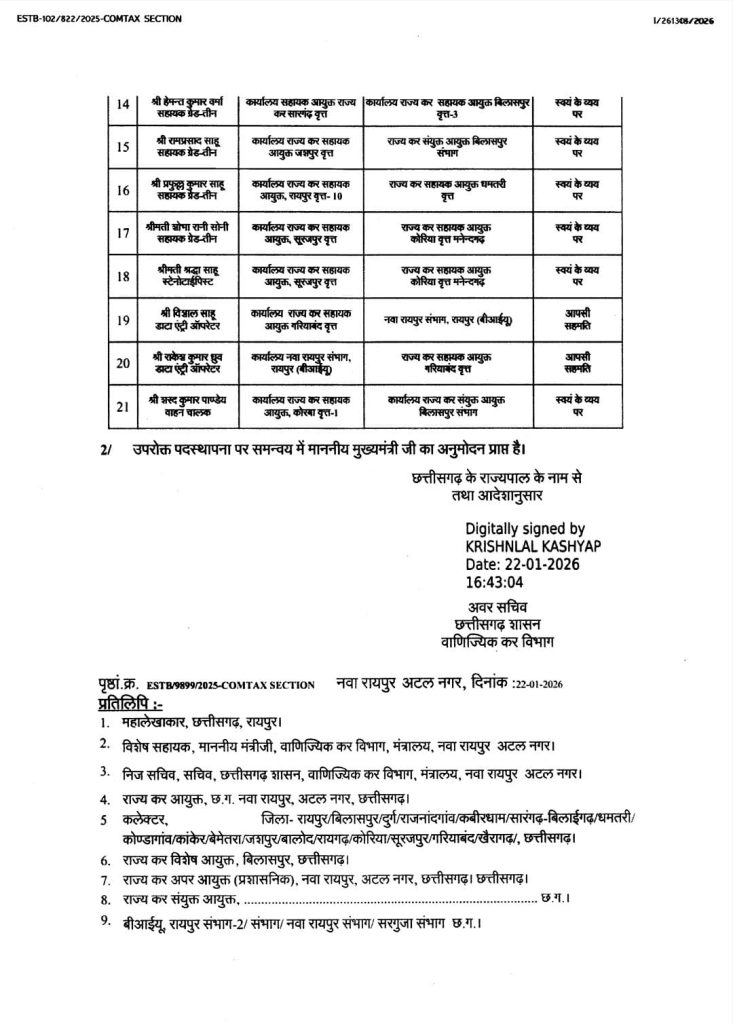 CG TRANSFER BREAKING: वाणिज्यिक कर विभाग में बड़ा फेरबदल, 21 कर्मचारियों का हुआ तबादला