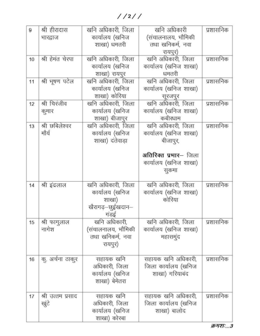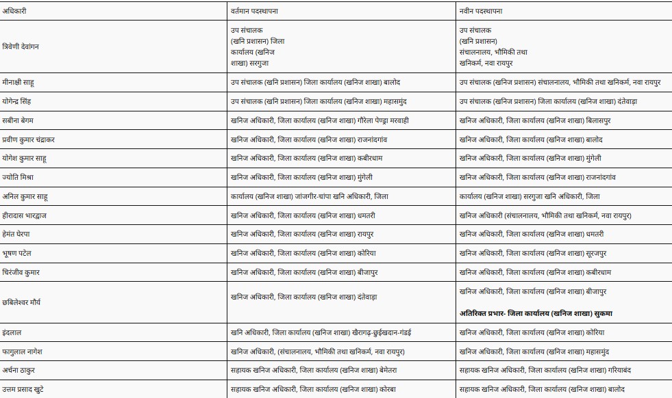 सरगुजा जिले में अवैध माइनिंग का खुलासा होने के बाद खनिज विभाग में बड़ा फेरबदल हुआ है. सरगुजा खनिज अधिकारी त्रिवेणी देवांगन को हटा दिया गया है. देखें पूरी लिस्ट-