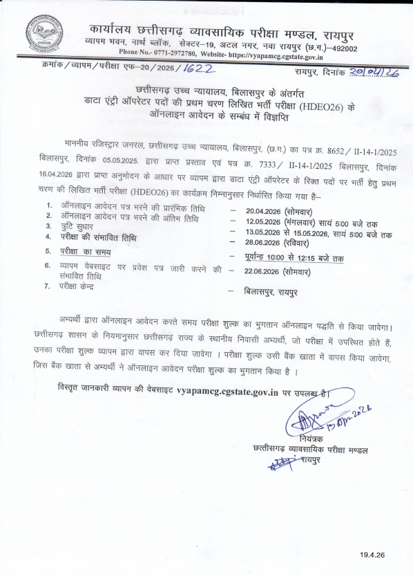 CG Vyapam Recruitment 2026: छत्तीसगढ़ में सरकारी नौकरी का इंतजार कर रहे युवाओं के लिए बड़ी खुशखबरी है. जहां छत्तीसगढ़ व्यावसायिक परीक्षा मंडल (सीजी व्यापम) ने 2026 के लिए डेटा एंट्री ऑपरेटर (डीईओ) भर्ती की आवेदन प्रक्रिया शुरू कर दी है. जिसके तहत छत्तीसगढ़ हाई कोर्ट में 38 रिक्त पदों को भरा जाएगा. योग्य उम्मीदवार आधिकारिक वेबसाइट https://vyapamcg.cgstate.gov.in/ के माध्यम से ऑनलाइन आवेदन कर सकते हैं.