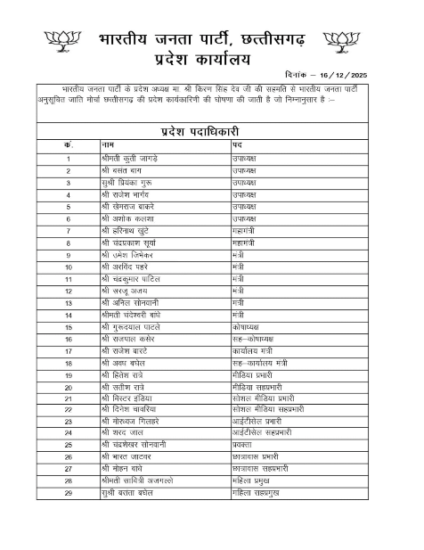 बीजेपी ने अनुसूचित जाति मोर्चा छत्तीसगढ़ की प्रदेश कार्यकारिणी घोषित की. प्रदेश अध्यक्ष किरण सिंह देव की सहमति के बाद कार्यकारिणी और जिला अध्यक्षों के नामों का ऐलान किया गया है. इसमें 33 नाम शामिल हैं. इसमें 6 उपाध्यक्ष, दो महामंत्री, 6 मंत्री, 1 कोषा अध्यक्ष 2 सह कोषा अध्यक्ष, कार्यालय मंत्री, सह कार्यालय मंत्री और मीडिया प्रभारी के साथ अन्य की नियुक्ति की गई है.