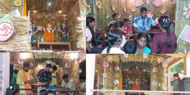 अब तक आपने अलग-अलग अंदाज में विघ्नहर्ता को देखा होगा, लेकिन युवाओं ने कुछ अलग कर दिखाया है. जी है. जांजगीर के चांपा क्षेत्र के कोसमंदा गांव के ठाकुरदेव चौक में छत्तीसगढ़ी अंदाज में भगवान विघ्नहर्ता विराजमान है. यहां कुटिया के रूप में घास से अनोखा पंडाल बनाया गया है और सुपा, छिटिया सहित अन्य चीजों से भव्य सजावट की गई है. साथ ही, अलग-अलग तरह से लाइटें लगाई गई है, जो लोगों को खूब पसंद आ रहा है और तारीफ करें बिना लोग नहीं रह पा रहे हैं. सबसे विशेष बात यह भी है कि भगवान विघ्नहर्ता किसान रूप में विराजमान हैं और हाथों में हल, हसिया, गैंती पकड़े हुए हैं, वहीं रिद्धि-सिद्धि को छत्तीसगढ़ी अंदाज में सजाया गया है और लुगरा सहित अन्य वेश भूषा से सुशोभित है. जो लोगों के लिए आकर्षक का केंद्र बना हुआ है.