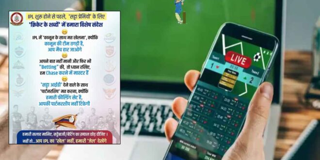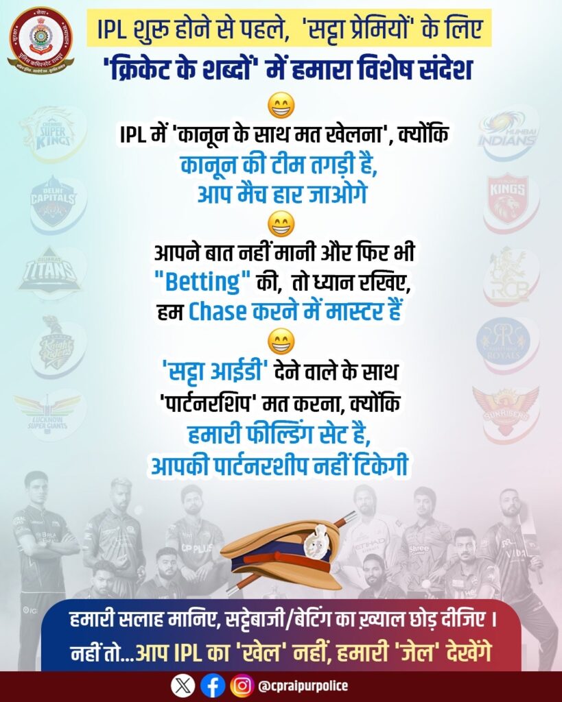 रायपुर पुलिस ने IPL शूरू होने के पहले सट्टेबाजों को सख्त चेतावनी दी है. रायपुर पुलिस की तरफ से एक खास संदेश जारी किया गया है. जिसमें लिखा है ‘कानून के साथ मत खेलना’, वरना मैच ही नहीं, जेल भी देखनी पड़ेगी…पुलिस ने क्रिकेट की भाषा में समझाया, और लिखा कि – बेटिंग करने वालों पर कड़ी कार्रवाई तय, ‘चेज’ करने में माहिर है कानून की टीम…फर्जी सट्टा आईडी देने वालों से दूरी बनाने की अपील, नहीं माने तो ‘पार्टनरशिप’ नहीं टिकेगी… सट्टेबाजों के लिए रायपुर पुलिस का साफ संदेश है- सट्टेबाजी छोड़िए, वरना सीधा जेल का रास्ता मिलेगा.