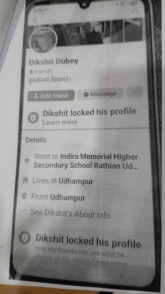दक्षित दुबे का तीसरा फर्जी अकांउट पंजाब राज्य के उधमपुर के नाम से बनाया गया है। इस अकाउंट में दक्षित दुबे को इंदिरा गांधी मेमोरियल हायर सेकेंडरी स्कूल उधमपुर में पढ़ना बताया गया है। इस स्कूल में भी संपर्क करने पर दक्षित दुबे नाम का कोई विद्यार्थी के पढ़ने से इंकार किया गया है। दक्षित दुबे के नाम और फोटो वाले चौथे अकाउंट मध्यप्रदेश के इंदौर जिले के डुमरांव स्थान के डी के कालेज में स्टूडेंट बताया गया है। इस बारे में पता किए जाने पर जानकारी मिली कि डुमरांव में डी. के कालेज में दक्षित दुबे नाम का कोई स्टूडेंट ही नहीं है।