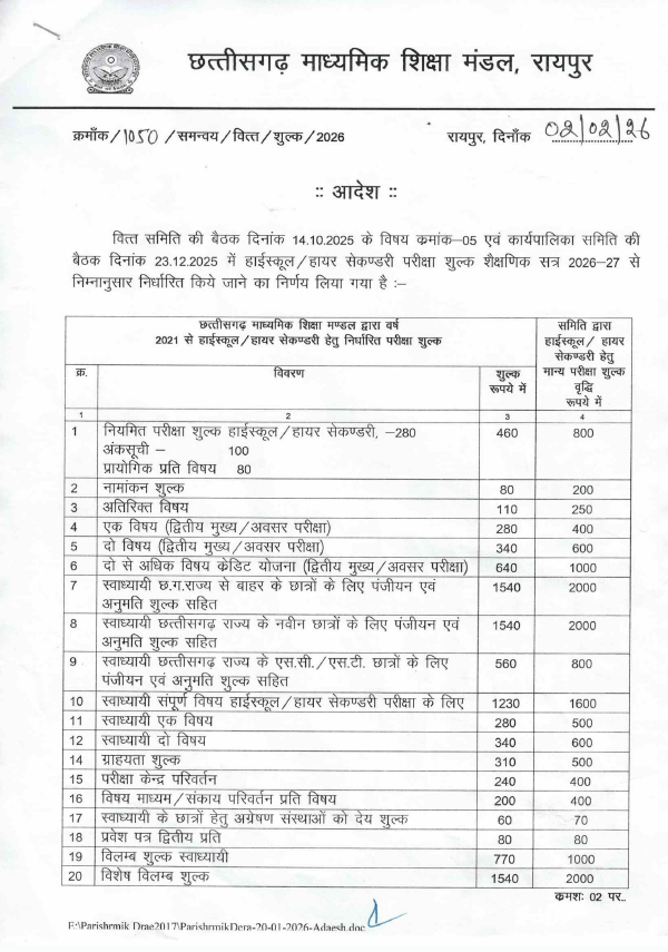 CG News: छत्तीसगढ़ माध्यमिक शिक्षा मंडल (माशिमं) ने पांच साल बाद 10वीं और 12वीं बोर्ड परीक्षाओं के शुल्क में बढ़ोतरी कर दी है. 2026-27 सत्र से लागू नए शुल्क के तहत नियमित परीक्षार्थियों को अब बोर्ड परीक्षा, अंकसूची और प्रति विषय प्रैक्टिकल मिलाकर 800 रुपये चुकाने होंगे. पहले इसके लिए 460 रुपये देने पड़ते थे. इसे लेकर माशिमं की सचिव पुष्पा साहू आदेश जारी किया है.