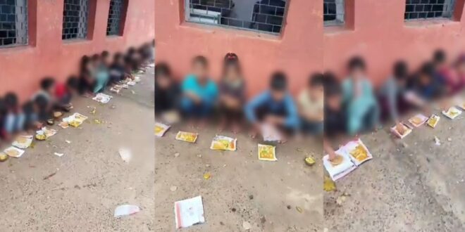 दरअसल, गुरुवार (6 नवंबर) को एक वीडियो सामने आया, जो हैरान करने वाला था. श्योपुर जिले के विजयपुर क्षेत्र के हुल्लपुर में स्थित शासकीय माध्यमिक विद्यालय में विद्यार्थियों के स्वास्थ्य की परवाह ना करते हुए खाना जमीन पर परोस दिया गया था. बच्चों को स्कूल की बिल्डिंग के बाहर बैठाया गया. उन्हें दीवार के सहारे जमीन पर बैठा दिया गया और पेपर पर ही रोटी-सब्जी परोस दी गई. इस पूरे मामले को एक शख्स से रिकॉर्ड कर लिया और सोशल मीडिया पर पोस्ट कर दिया. इसके बाद ये मामला वायरल हो गया.