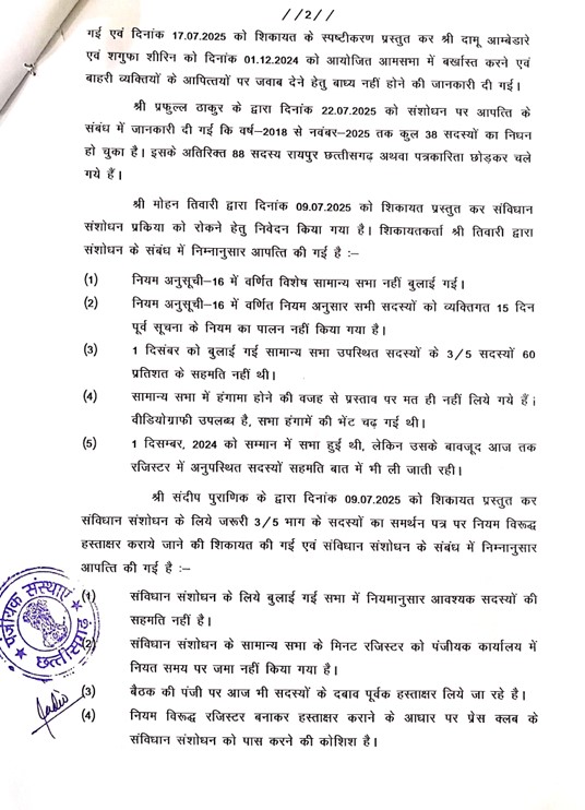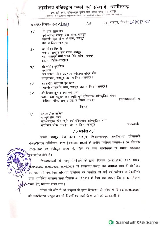 रायपुर। प्रेस क्लब रायपुर के वर्तमान पदाधिकारियों का कार्यकाल आठ माह पहले ही खत्म हो गया था। चुनाव कराने कार्यकारिणी पर बड़ा दबाव था, लेकिन चुनाव कराने की घोषणा नहीं की जा रही थी। वहीं वर्तमान कार्यकारिणी के द्वारा प्रेस क्लब के संविधान में संशोधन कर कार्यकाल बढ़ाने और पंजीयक के समक्ष ऑनलाइन अपलोड़ करने को लेकर आवेदन लगाया गया था।