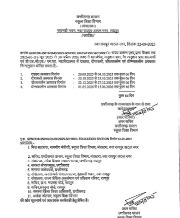 छत्तीसगढ़ में सितंबर के अंत और अक्टूबर में कई बड़े त्योहार पड़ रहे हैं, जिनकी वजह से स्कूलों में छुट्टियां होने वाली हैं। प्रदेश के शैक्षणिक संस्थानों में दशहरा-दिवाली, समर-विंटर वेकेशन अब 64 दिन का होगा। छत्तीसगढ़ सरकार के अवर सचिव ने इस संबंध में आदेश जारी किए है।