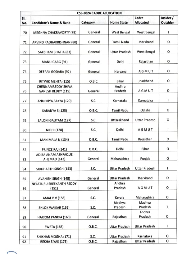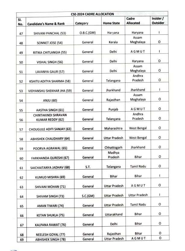यूपी के शिवम सिंह, सिद्धार्थ सिंह,स्वेता, संदीप कुमार,राम भरोसे सरन को भी होम कैडर मिला है. जबकि बाहरी राज्यों से संबंधित उत्तराखंड की सनोली गौतम, राजस्थान की रेखा सियक, आयुष जायसवाल, अपूर्वा सिंह, आयुष सैनी,मुकुल खंडेलवाल और तमिलनाडु के थंगैयारासन टी को यूपी कैडर आवंटित किया गया है. DoPT द्वारा राज्य कैडर आवंटित करने के बाद प्रोबेशन के लिए जल्द संबंधित राज्यों को रिपोर्ट करना होगा. जिसके बाद शासन, जिलों में SDM की पहली तैनाती प्रदान की जाएगी.