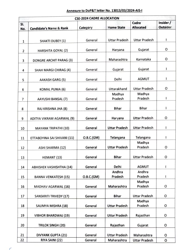 2014 की IAS टॉपर शक्ति दुबे को मनमर्जी का होम कैडर यूपी आवंटित किया गया है. कोमल पुनिया उत्तराखंड, मयंक त्रिपाठी को यूपी कैडर मिला है. इसके अलावा ऊपरी रैंकिंग में हरियाणा के आदित्य विक्रम अग्रवाल, बिहार के हेमंत, संस्कृति त्रिवेदी, महाराष्ट्र की रिया सैनी, शिवांश सुभाष जागड़े को यूपी कैडर में शामिल किया गया है.