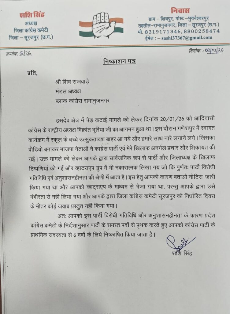 दरअसल, बीते दिनों स्कूली बच्चों के द्वारा कि गई नारेबाजी को लेकर सोशल मिडिया में किए गए पार्टी विरोधी पोस्ट पर कार्यवाही करते हुए कांग्रेस की नव नियुक्त जिला अध्यक्ष शशि सिंह ने ये आदेश जारी किया है.