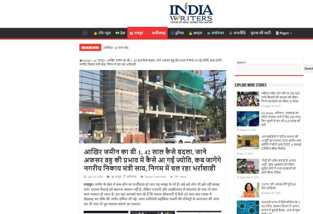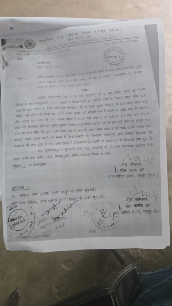 रायपुर। राजधानी रायपुर के शहीद चुड़ामणी वार्ड क्रमांक-38 के अंतर्गत समता गूह निर्माण सोसायटी के बाहर चिरहुलडीह में शिकायत कर्ता की पुरखौती जमीन में प्रभावशाली लोगों ने कब्जा कर उस पर निर्माण कर लिया था। पूरा मामला ऑनलाइन नामांतरण से जुड़ा हुआ है। मामले में जोन क्रमांक-7 के जोन कमिश्नर ने तहसीलदार रायपुर को पत्र लिखकर चिरहुलडीह के पटवारी हल्िा नंबर 00052 के खसरा नंबर 905, 906 और 907 के संबंध में भू-स्वामित्व की जांच कर तथ्यात्मक रिपोर्ट मांगी है। पत्र की प्रतिलिपि नगर निवेशक नगर पालिक निगम रायपुर और आयुक्त नगर निगम रायपुर को भी दी गई है। मामले में विधानसभा में ध्यानाकर्षण सूचना के माध्यम से लगाए जाने के बाद निगम प्रशासन हरकत में आया और मामले की जांच में आगे बढ़ी है।